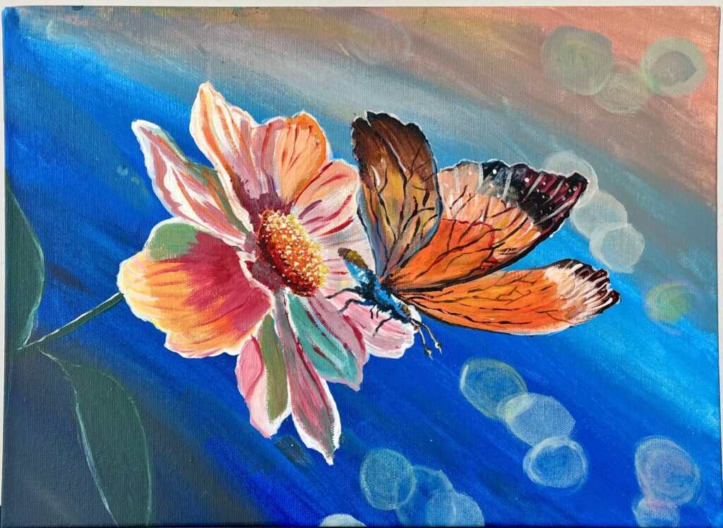 A delicate butterfly rests on a blooming flower, as if the world has paused just for this quiet moment. I painted this scene thinking about stillness—the kind that lets you breathe deeper and notice beauty you usually rush past. The gentle colors and soft details invite you to linger, the way I did while bringing it to life. Every time I look at it, I feel a calm joy, and I hope it gives you the same sense of wonder and peace.